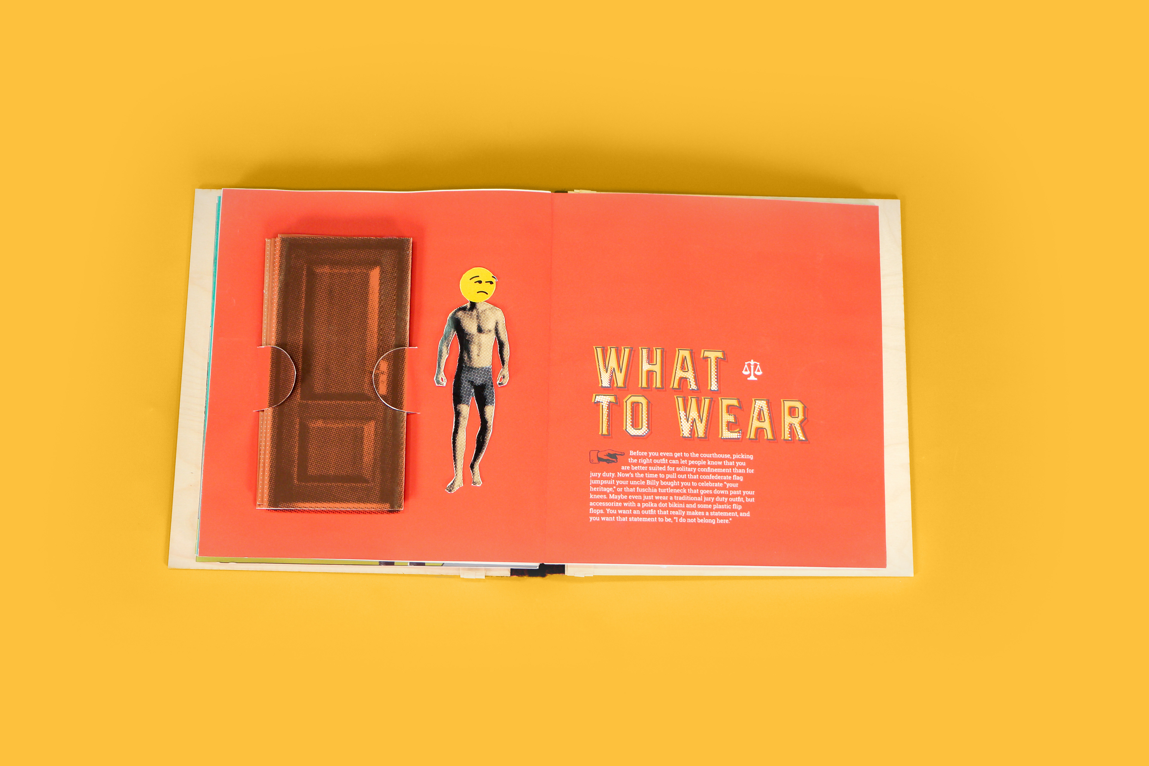 The cover is laser engraved on wood and bound in leather to give off the courtroom vibes. To contrast the cover's simplicity, the title spread opens up to a jury shouting match and bored jurors, while lady justice watches.